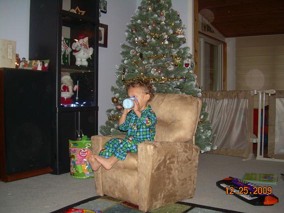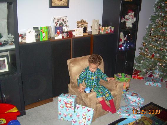 After the usual morning routine (diaper change and juice cup), we went out to the living room where Santa had left all of the gifts: a new kid-sized recliner chair, lots and lots of foam building blocks, and several wrapped presents: a magna doodle, a see-n-say animal sounds toy, a dump truck, and new snow boots! Eric went straight for the chair, climbed in, and set his cup in the cup holder. He was happy!