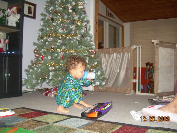 Now, on to the family presents. Eric picked up the first present from under the tree from Brock and Lua. He opened it with big smiles. New books! Eric loves to sit and read through books with Mommy and Daddy. Eric picked up another present from under the tree from Mommy and Daddy! As he brought it over to me to sit and open it, he says, “piano!” Now, how did he know without unwrapping what was inside? Mommy and Daddy were stunned. Sure enough, he tore open the wrapping and there was his new toy piano keyboard!