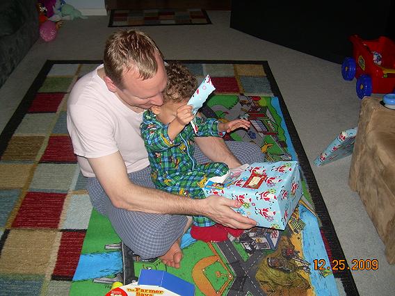 After a few minutes, we coaxed him out of his chair to open some gifts. He tore through the wrapping paper like an old pro. He had plenty of practice at Grandma’s and Grandpa’s house last weekend. What fun! Christmas morning is a blast! Mommy and Daddy enjoyed it just as much as Eric (maybe more).
