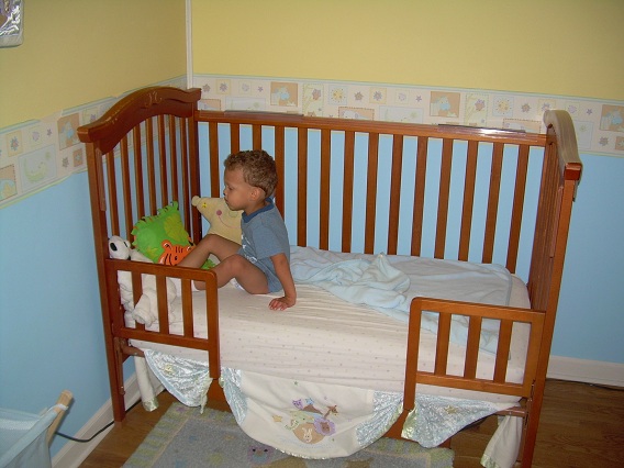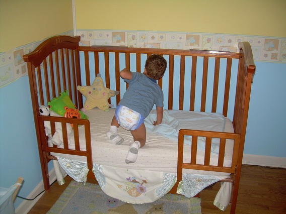 The next day, Mommy went into Eric’s room to wake him up.  She found him with one leg up trying to climb out of the crib.  From the inside, there are no footholds for climbing, so he was not making much progress…yet.  Eric is a very good climber and surely would have figured it out soon.
