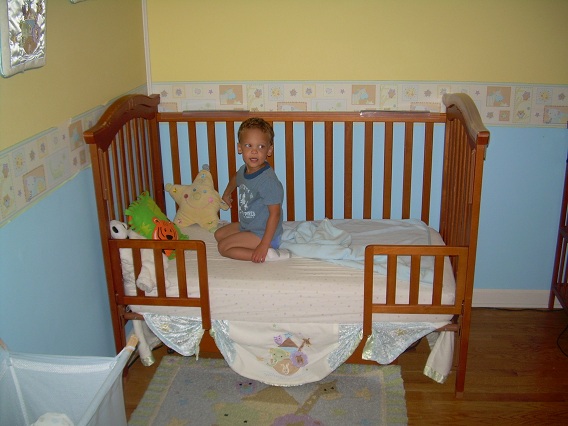 Earlier this week, Mommy called me at work to tell me about something that Eric had done.  Eric was running around the house, following Mommy as she did some household chores, laundry and such.  Mommy was in our bedroom, when Eric went into his own room.  Mommy soon heard Eric ask for help.  “Help” he said very calmly, but Mommy could tell that he really needed help, not just playing for attention.  So Mommy went into his room and found him half way over the side of his crib.  He needed help, because after climbing up, he was not sure how to get down.  He was too high to jump back down to the floor.  If he jumped into the crib, he would not be able to get back out.  He was experiencing a dilemma.  He was not panicked.  He had himself securely on top of the crib rail.  He simply did not know how to get down.  Mommy calmly walked over and helped him down, surprising herself that she did not panick.  She set Eric back on the floor and explained to him that he cannot climb on the crib.  It turns out, he wanted his star pillow out of the crib.  Of course after all this, when Mommy retrieved the star pillow, he promptly tossed it back into the crib and moved on to other toys.