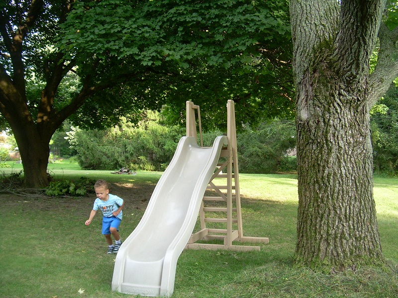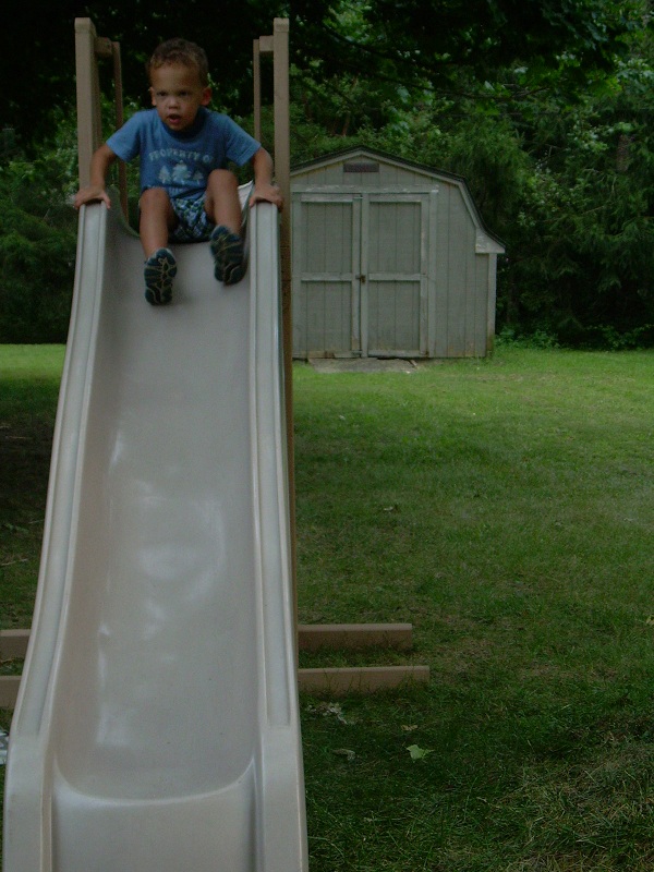 Eric got a new slide!  Grandpa D was able to get a slide for Eric.  Grandpa built a ladder and platform to support the slide.  It is really a lot taller than his old slide.  Eric loves it!  Grandpa delivered it on the weekend of our annual cookout.  It required some assembly, so Grandpa and I worked until dark Friday night setting it up.  Of course we had help from Eric.  He was our test pilot.  We observed some of his difficulty climbing the ladder, so we made modifications to increase the angle and added handrails.  He now climbs it easily and with confidence.  But most importantly, he loves to slide down!  Thank you Grandpa!