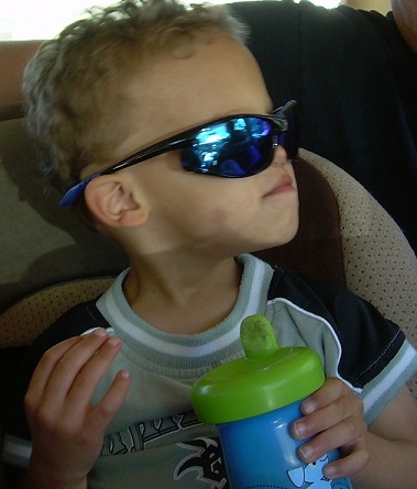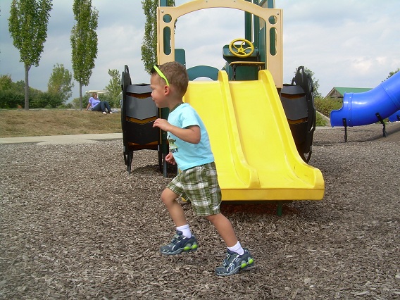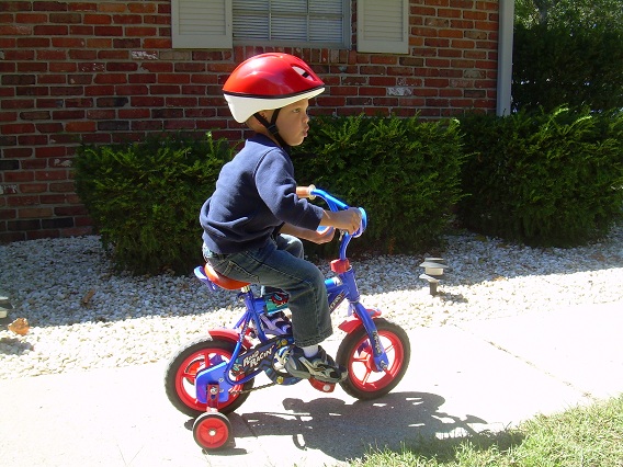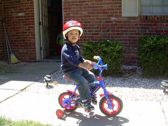 We went shopping again on Saturday for a tricycle. This time, we went to Target, hoping to find a different selection of tricycles. No luck. Target has the same tricycle that we saw at Meijer, but for more money. We did find a reasonably priced helmet and bought it. Hmmm…what to do about a tricycle? Let’s try Toys-R-Us again. Eric is in a better mood today and not so close to nap time. First, we stop across the street from Target to drop off some old toys and clothes at the Goodwill store. As I am driving into the parking lot, I realize that Goodwill would be a good place to look for a tricycle. So, after we drop off the stuff in back, we parked out front and went into the store. We did not find any tricycles in the Goodwill store, but we did find a small bicycle with training wheels for $8! Eric liked it! He got on and rode back and forth in the store aisle while I helped him balance. I bought it, and we took it home. The horn on the handlebars was broken, so we stopped at Meijer on the way home to buy a new horn. The bike accessories are all the way in the back of the store. I found a bell and a horn. Eric decided that he liked the horn better, so I put the bell back, and we headed for the registers. Eric squeezed the horn all the way through the store. He had so much fun!