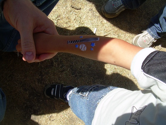 On Sunday, we went to downtown Indianapolis for the annual Rib Fest. We walked around, sampled some good food, and got free ice cream. Before we left, Aunt Cindy bought a tattoo for Eric. They looked over all the possible tattoos and decided on a baseball and bat with stars. Eric looked so cool, and he knew it!
