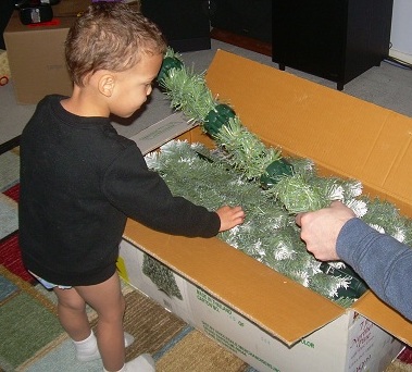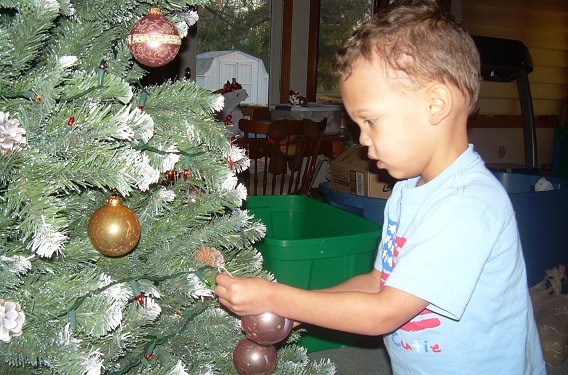 Friday morning, we drove home. Eric napped in the car on the drive up and on the drive back. Aunt Deborah was riding in the back seat with Eric. They both took a nap on the way home. After we settled back into the house, we started decorating for Christmas. We started by putting up the Christmas tree. Eric was glad to help. Eric, Mommy, and I unpacked the Christmas tree and fluffed up the branches one at a time as I snapped them onto the tree. After the tree was up, it was time for Eric’s nap. He was so excited about the tree that he did not want to go to sleep. Once down in his bed, though, he fell asleep shortly. Mommy and I continued putting out decorations, but we saved the tree for last after Eric got up. Eric was very helpful. He put several ornaments on the tree.