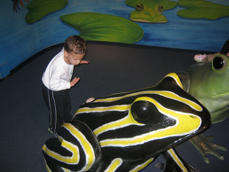 When we arrived at Covington, we went directly to the aquarium in Newport, KY nearby.  We saw all kinds of fish and other animals.  We saw gold fish, blue fish, yellow fish, sharks, octopus, crabs, turtles, starfish, jelly fish, frogs, sting rays.  Eric got to touch a starfish.  I touched a shark, but Eric could not reach far enough to touch it.  He tried, but he had just as much fun just splashing the water.  We also saw birds, snakes, and seals.  Unfortunately, the penguin exhibit was closed for construction.  Apparently they were building more penguins 🙂  I was disappointed, because the penguins are my favorite animals at the aquarium.  Eric was having so much fun.  He was not always pleased when we decided it was time to move on to the next exhibit.