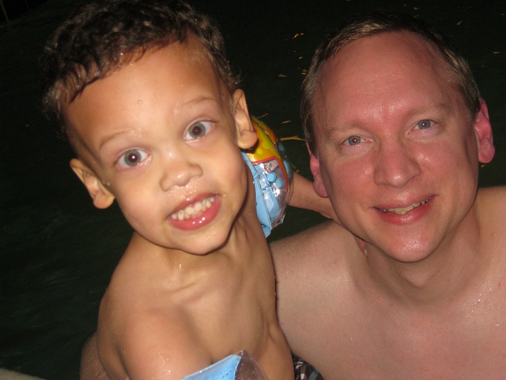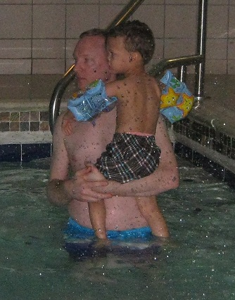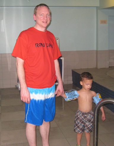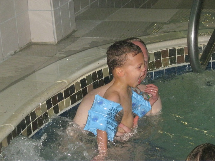 We ordered room service for dinner.  Eric had some very yummy spaghetti with meat sauce.  After dinner, we suited up to go to the swimming pool!  Eric was excited.  He had been talking about the swimming pool since he found out that we were going to a hotel.  He remembered the pool from the last hotel that we stayed in.  He did not go in the pool that time, because the water was too cold.  That was not a problem this time.  I think the water was a little warmer, but mostly I think Eric was too excited about it to not go in the pool this time.  It did not take long.  In fact Eric could not get in the pool fast enough.  We grabbed a “noodle” that was floating in the pool, and Eric floated all around.  I helped him float around the pool.  We made several laps back and forth, while Mommy watched.  After a while, we got out of the pool and into the hot tub.  The temperature was just warm, not too hot, and Eric loved the water jets.