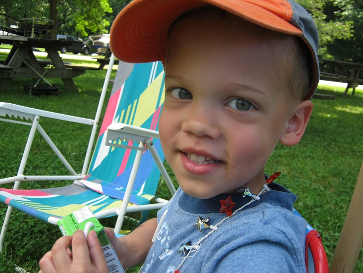 Saturday was a fun-filled day!  We played games and split into groups for a scavenger hunt!  Eric and I were together on the same team.  Michael was our team captain, and we had Uncle Joe, Aunt Deborah, Josh, Brianna, and Grandma on our team.  The hunt required some significant travel around the campground, so we all piled into Uncle joe’s suburban.  Eric and I sat in the very back with the hatch window open.  Eric enjoyed this a lot!