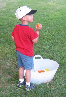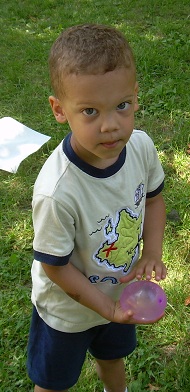 At home, we threw some “poppers” on the ground to listen the the loud “crack!” sound that they made.  We also had a few small fireworks after the sun started to set.  Eric stayed up past his usual bed time to see the fireworks.  He also was still holding on to the water balloon that he had brought home from the party.  After a while, I told him to go ahead and throw it on the sidewalk.  I figured the sooner he let it go, the easier the separation would be.  He had carefully carried it out of the party, and asked me to put it in the trunk until we got home.  Instead, I found a safe place for it in his cup holder, and I told him not to play with it while we were in the car.