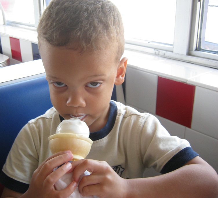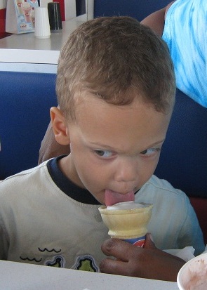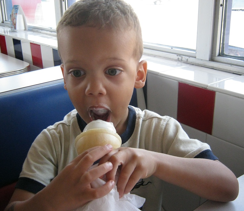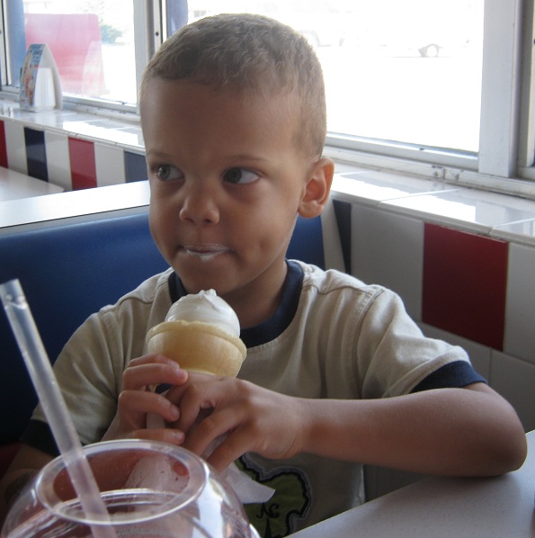 On Sunday, we packed up, closed the camper, and headed for home.  Another great weekend with the D family!  Eric had fun, and so did Tyler.  Tyler is already looking forward to next year!  Same as the rest of us!  On the way home, we made our traditional stop at the Dairy Queen in Avon, IN.  We ate lunch, and of course had ice cream.  Mommy and I realized that this was the first time that Eric ever had ice cream from a cone!  It was a new experience for him.  I enjoyed showing him how to lick around the edges and keep it from dripping.