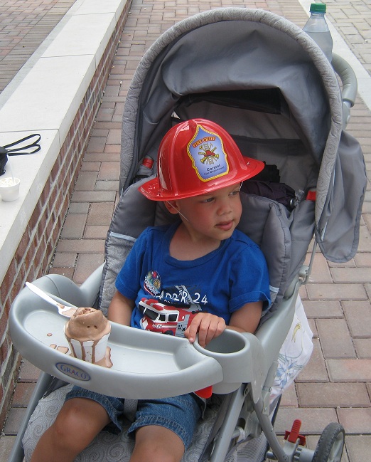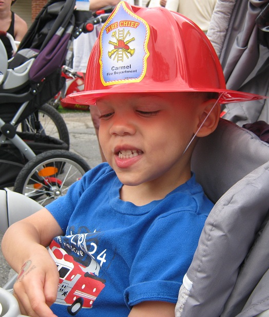 On July 4th, I took Eric to the parade that runs through downtown Carmel.  Mommy was not feeling well, so it was just us boys for the morning.  I promised Mommy that I would take plenty of photos of the parade for her.  Mommy loves parades!  this would be Eric’s first parade.  He was very excited about going.  We drove downtown and parked the car.  Eric and I had to walk a few blocks to the parade.  Luckily, I remembered to bring his stroller.  Unfortunately, I forgot to bring a chair for myself to sit.  I grabbed our emergency blanket from the trunk and put it in the bottom of Eric’s stroller.  I thought I could sit on it when we found a spot to watch the parade.