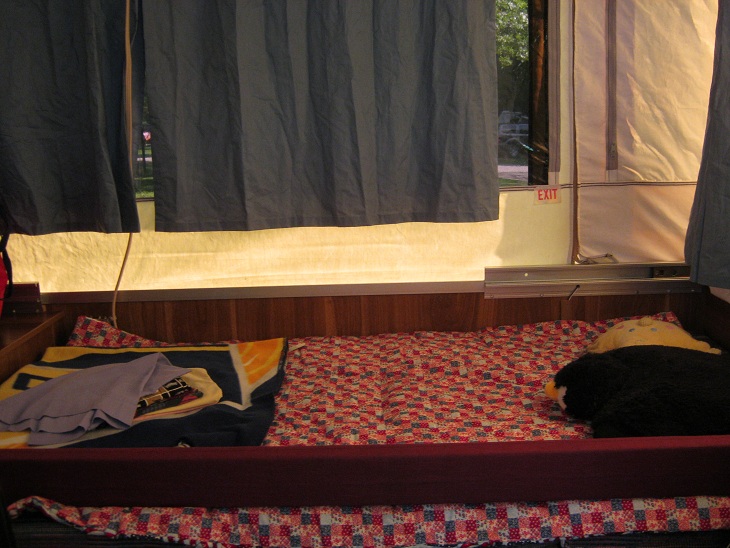 Eric is so proud of his bed in the camper.  I fixed it up special just for him.  I installed a safety rail to keep him from rolling out of bed, and I installed a safety cover over the electrical outlet.  Mommy also appreciated these safety measures.  Eric slept well on the camping trip.