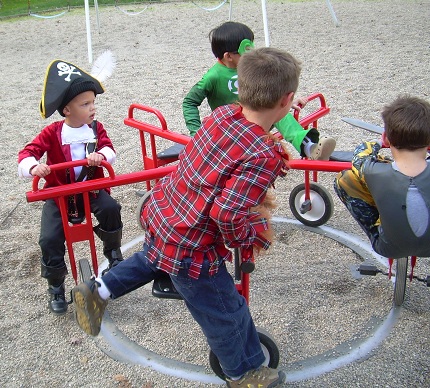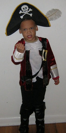 When we arrived at home. We quickly ate some lunch and got Eric dressed in his Halloween costume. Halloween was not until tomorrow, but the annual neighborhood parade was scheduled for today. We had just enough time to get ready. I helped Eric get into his pirate costume. We had picked it out earlier in the month during one of our trips to Menards. Mommy and I had looked at most of the usual stores for a pirate costume without luck. But Eric and I happened across 2 different pirate costumes at Menards. Eric chose the one with the captain’s hat. The parade (actually just a herd of costumed kids moving along the sidewalk) finished at the neighborhood playground where some of the parents had prepared snacks, treats, and activities for the kids. Eric played on the playground with some of the other kids, and then I told him that there was juice and cupcakes “over there”. He immediately jumped off of the playset and made tracks to the treats. He enjoyed a chocolate cupcake and some juice, then back to the playground!