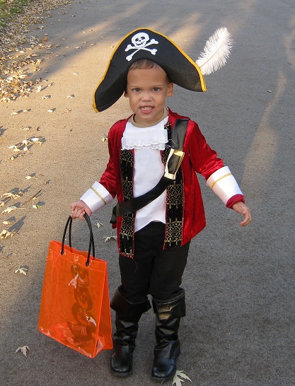 Halloween! I got home from work with just enough time to help Eric into his costume, so we could go trick-or-treating before dinner. Eric enjoyed running from house to house and saying “trick or treat!” A few times, he even added a “gar!” in keeping with the pirate theme. After several houses, he complained that his treat bag was too heavy, so Mommy and I carried it from house to house for him, except the last bit of sidewalk up the front door. That was his important job! Miraculously, it was none too heavy when it came time to open it up for more treats!