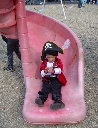 When we arrived at home. We quickly ate some lunch and got Eric dressed in his Halloween costume. Halloween was not until tomorrow, but the annual neighborhood parade was scheduled for today. We had just enough time to get ready. I helped Eric get into his pirate costume. We had picked it out earlier in the month during one of our trips to Menards. Mommy and I had looked at most of the usual stores for a pirate costume without luck. But Eric and I happened across 2 different pirate costumes at Menards. Eric chose the one with the captain’s hat. The parade (actually just a herd of costumed kids moving along the sidewalk) finished at the neighborhood playground where some of the parents had prepared snacks, treats, and activities for the kids. Eric played on the playground with some of the other kids, and then I told him that there was juice and cupcakes “over there”. He immediately jumped off of the playset and made tracks to the treats. He enjoyed a chocolate cupcake and some juice, then back to the playground!