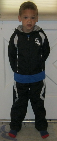 Eric is wearing his new baseball suit.  Aunt Cindy is trying to convert him to a White Sox fan!