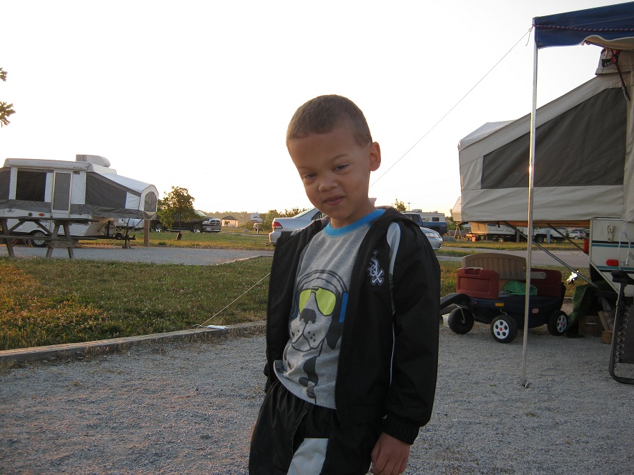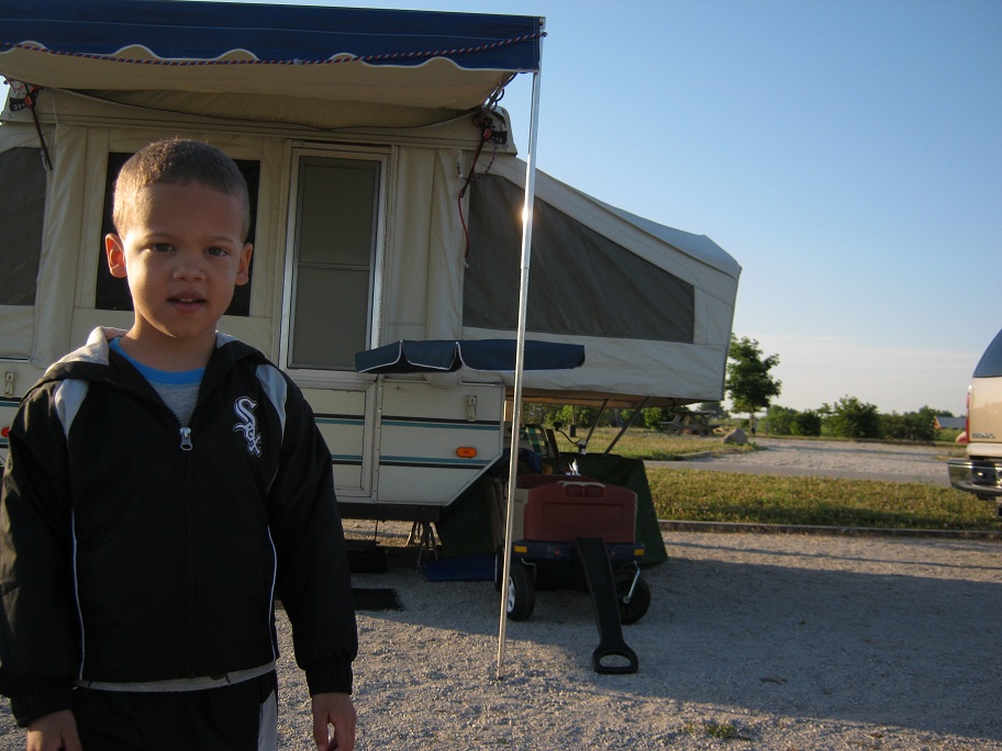 We went camping on the weekend of June 9.  The weather was so nice all week, so I told Mommy that I really wanted to go camping, so we made last minute reservations and packed up the camper.  I got off work early Friday, and we drove to Prophetstown  State Park just north of West Lafayette.  We arrived at the campground and got the camper set up just in time for a slightly late dinner.  Mommy heated up some hot dogs, while Eric and I finished setting up the camp site for the weekend.  Eric is a very good helper when we set up the camper.  It is his job to pull out the step, so we can walk in and out of the camper.