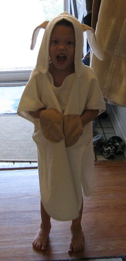After the weekend events, including meals and a very sticky breakfast, Eric was due for a bath.  Of course, to dry off, he wore his new bath robe.  Mommy and I bought the robe for him.  Seeing him wear it made me think of little Ralphie from A Christmas Story.  When I finally stopped laughing, I agreed that it was very cute!