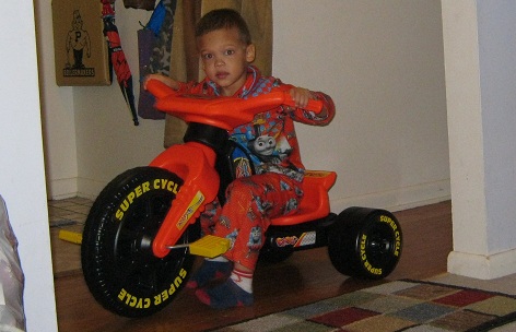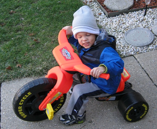 Eric gets to ride his new Super Cycle in the cold January air.  Santa brought this all the way from the North Pole, so it must be a cold weather toy!