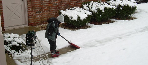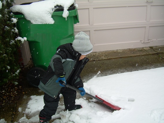 Eric could hardly wait to get to work shoveling the sidewalk with his new snow shovel from Santa.